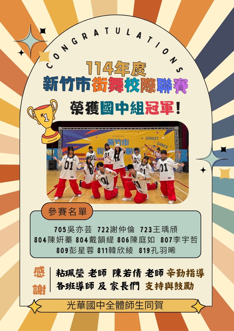 賀本校參加114年新竹市街舞校際聯賽國中組獲得冠軍!