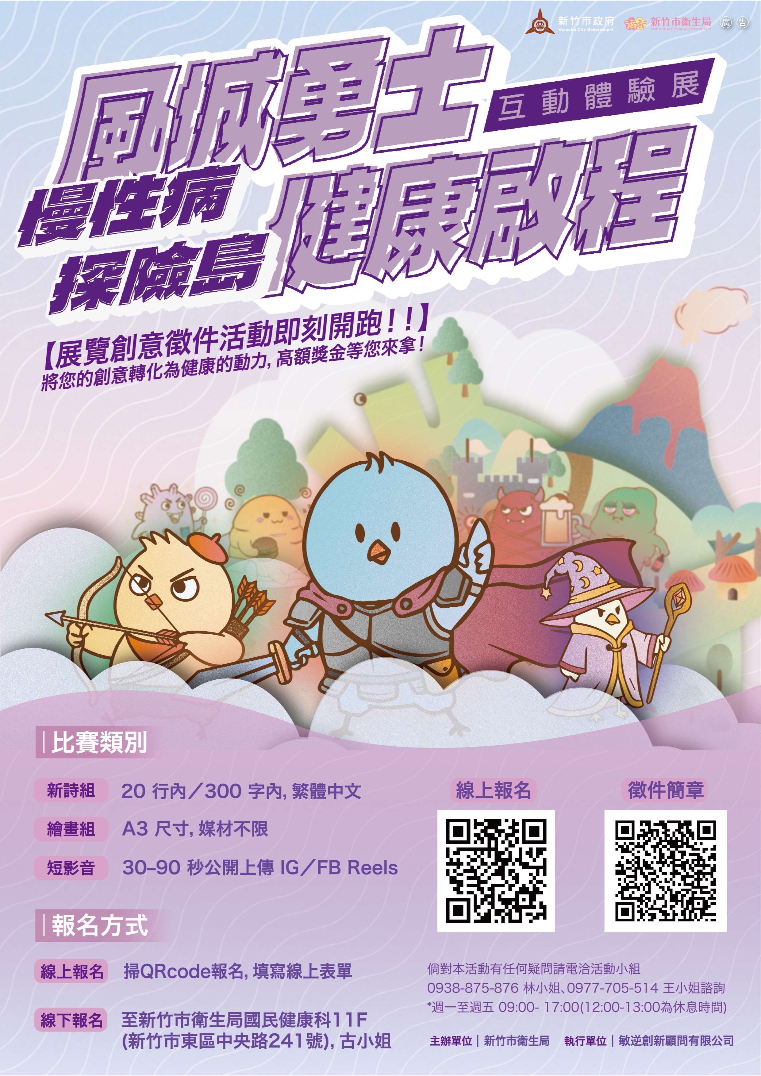 | 主旨: | 檢送本局辦理「115年『風城勇士 健康啟程』慢性病探險島:互動體驗展,徵稿活動辦法及簡章共1份,請貴單位踴躍報名參與,請查照。 |