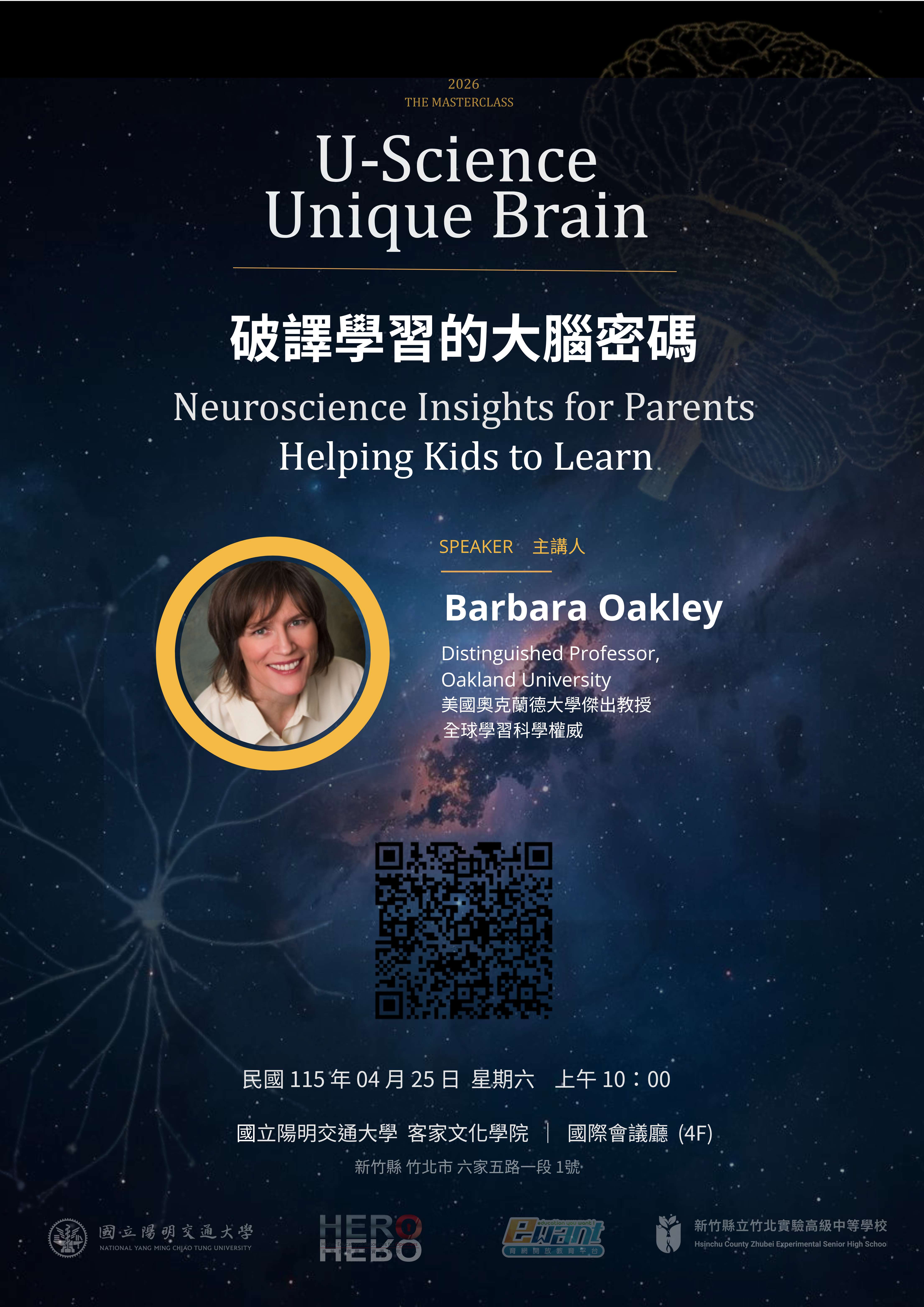 | 二、 | 本校與國立陽明交通大學教育研究所陳鏗任教授共備研發,制定校訂必修課程「學習之道:學習如何學習」的課程方針及教材教法;時值該校EWant開放式平台課程「學會學:學習之道」之原創學者美國奧克蘭大學的芭芭拉.歐克莉教授訪台期間,特邀專場講座「Neuroscience Insights for Parents Helping Students to Learn 破譯學習的大腦密碼」,此次主題為一份專為家長準備的指南,將神經科學的見解轉化為幫助孩子學習的實用建議;透過理解大腦運作的原理,我們將可以更有效地支持孩子的成長。 |